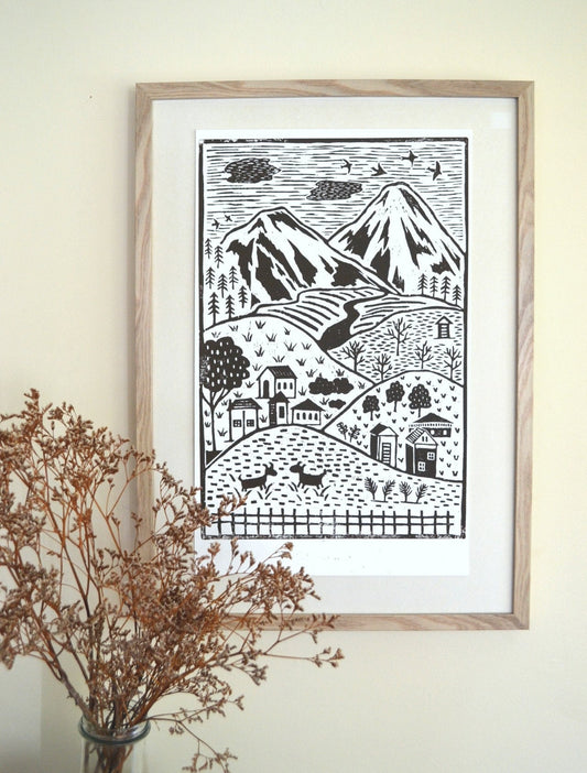 Little Village Lino Print - Brown