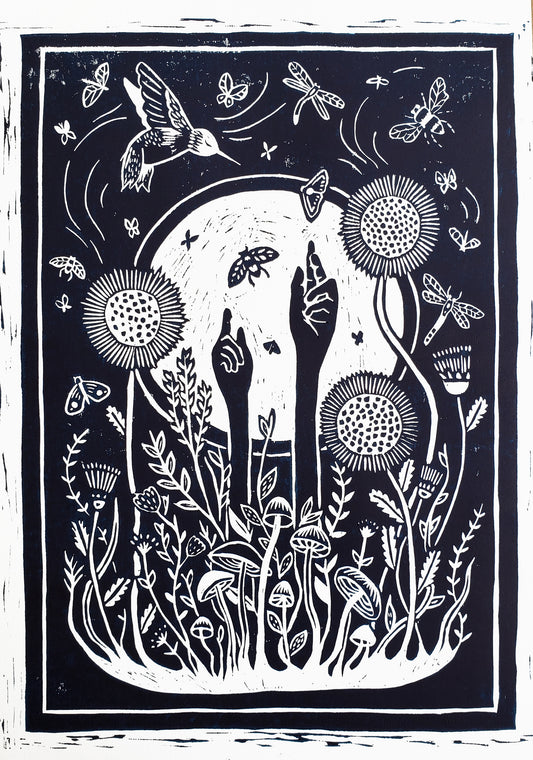 Growing Garden Navy Blue Lino Block Print