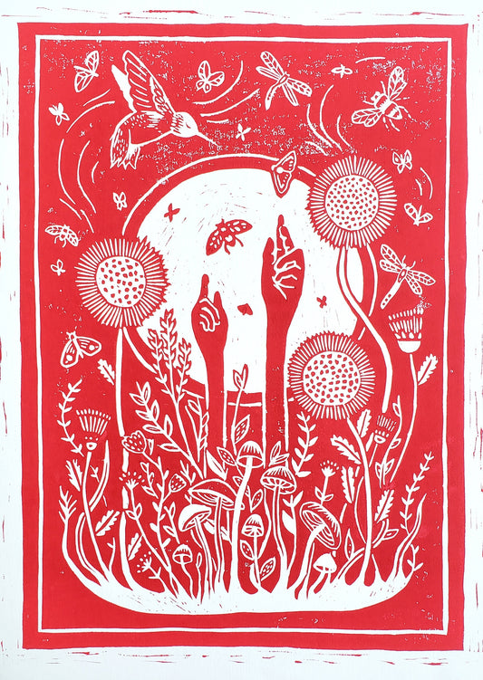 Growing Garden Red Lino Block Print