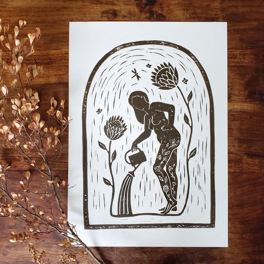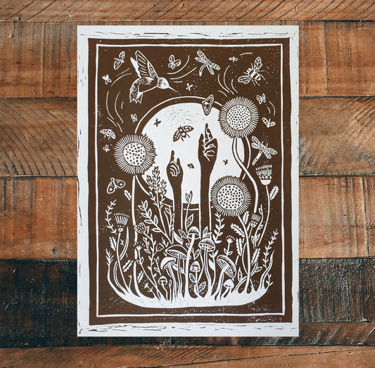 Growing Garden Brown Lino Block Print