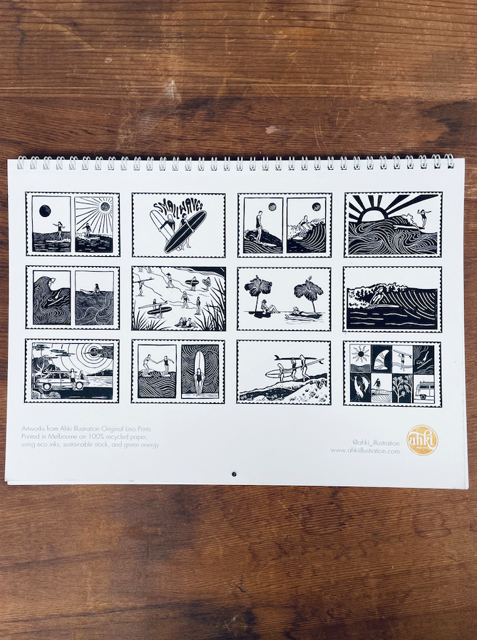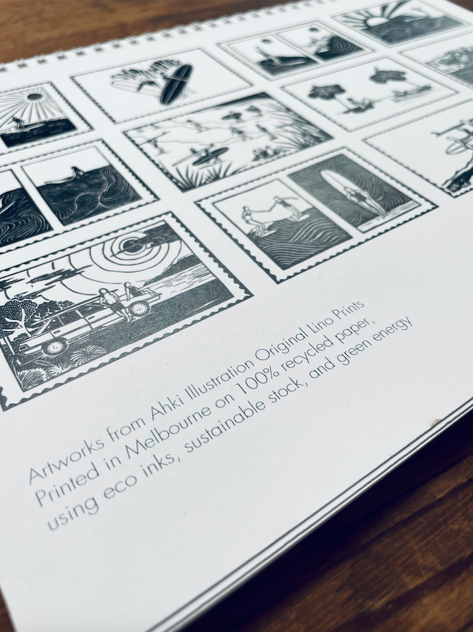 Each month showcases a hand-crafted piece inspired by the wild charm life by the ocean — surf, sun, sand and adventures. Thoughtfully printed in Melbourne on 100% recycled paper, using eco-friendly inks, sustainable stock, and green energy, this calendar celebrates art, nature, and conscious living.
